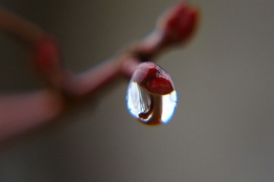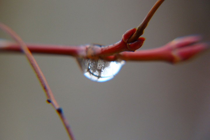 昨夜の雨でカエデの芽先に付いた水滴をコンデジに