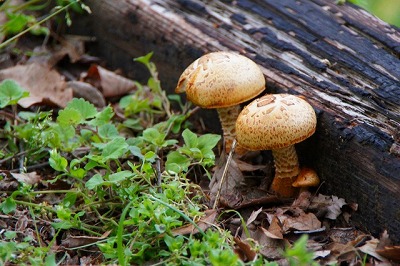 河川敷への土留めの脇にキノコが二つ並んで生え