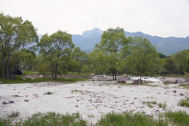 花崗岩の白い砂が引き詰められた大武川河川敷と