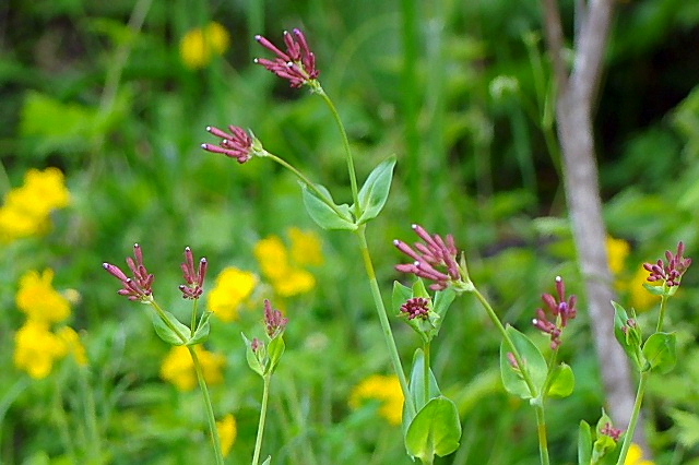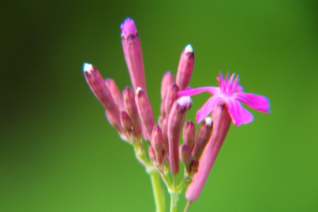 | ムシトリナデシコは小さい花が扇状に 咲きますが、写真は最初の一輪が咲い たところです。 河原や草地に咲く一年草で、毎年同 じ様なところに生えて来ます。 名前から食虫植物のように思います が身を守るため茎の繊毛に虫が捕まる ようです。 [ もう一枚見る !!] 群生しているムシトリナデシコのツボミ の状態で、全て咲くと扇状になります。 |