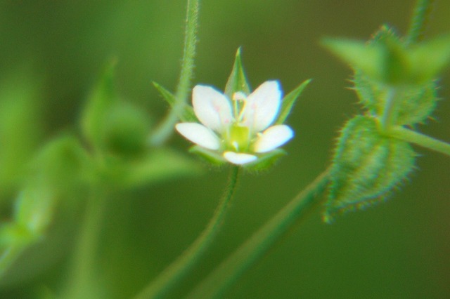 | 沢すじの草地も新しい雑草の花が少 なくなり、花を探していたところ、4ミリ 程の小さい白い花が咲いていました。 茎が細く花びらを囲むガクの方が大き い5枚の花びらでした。 [ もう一枚見る !!] 4ミリ程の小さな花をアップで撮って見 ましたが、葉、ガク共に繊毛が沢山生え ていますね!! |