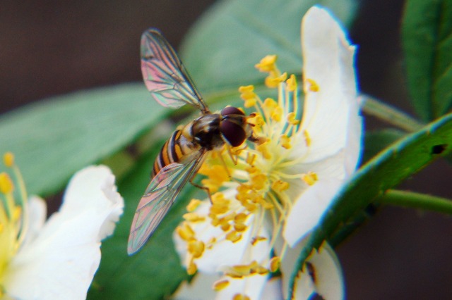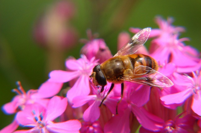 | ノバラの側で1センチほどの小さな細い、 ハチみたいなものがホバーリングしたり、 ノバラの蜜を吸っていました。 名前はホソヒラタアブで、嫌われ者の アブでしたが写真に撮ると案外絵になりま す。 [ もう一枚見る !!] こちらはピンク色に咲いたムシトリナデシ コの蜜を吸っているハナアブです。 体型はずんぐり系でハチの色合いをした 15〜6ミリ前後のアブです。 |