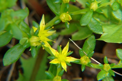 | 今日は新しい写真素材が無かったので 昨日写した写真をアップしました。 川淵に咲いていた1センチ程の黄色い 花で花びらが5枚の星形、マルバマンネ ングサだと思っていましたが葉の形が違 うためもう一度調べたら花のがそっくりの コモチマンネンゲサでした。 [ もう一枚見る !!] コモチマンネンガサを横から撮って見ま した。 |