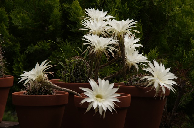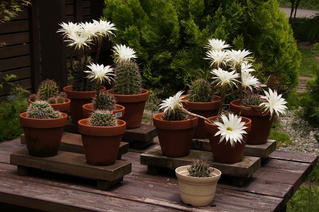 | サボテンが特に趣味と言うわけでは無い のですが、40年以上も私の所にいます。 と言うのもとても丈夫で1〜2ヶ月水をや らなくても枯れないからです。 花は年3〜4回咲きますが、今年は間延 びしたサボテンを半分に切り落としして 鉢に植え替えたため、今年初めての開花 です。 殖やそうっと思えばいくらで殖えるのです が、冬場は室内に入れないと枯れるため 置き場がありません。 [ もう一枚見る !!] 一日しか咲かない花が、DNAが同じとは 言え何時も一斉に同じ日に咲くのが不思議 です。 |