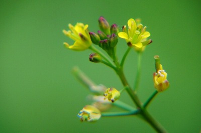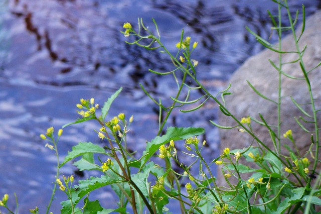 | 沢沿いに草丈40センチほどの細い茎の 先に黄色い4ミリ程の小さな花が無秩序に 広がっていました。 写真に撮ると、花びら雌しべの形が見た ことがある、イヌガラシにそっくり、でも茎の 姿が違う。 ネット図鑑で調べたら3回目に開いた図 鑑にありました。 カキネガラシとい言うイヌガラシの仲間で 垣根の様に広がるそうです。 [ もう一枚見る !!] 沢沿いに咲いていたカキネガラシの様子。 |