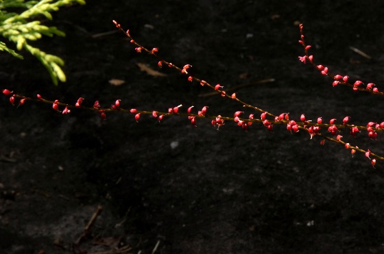 庭の外れに、細い花茎に沢山の小さな赤い花が咲いていました。正確には赤いのは萼です。