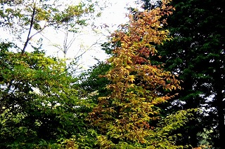 庭のヒメシャラが一番に紅葉し始めました。左の黄緑の木はエゴノキです。