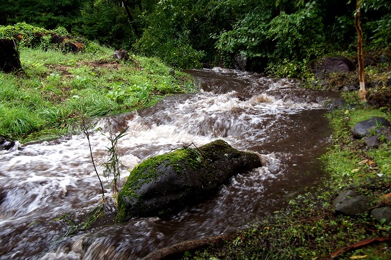 今週は月曜日の台風で、隣接の小川は豪雨により増水