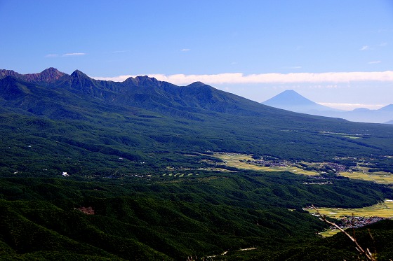 写真は八ヶ岳、左から、赤岳、阿弥陀岳、権現岳、編笠山、裾野の向こうには富士山が。