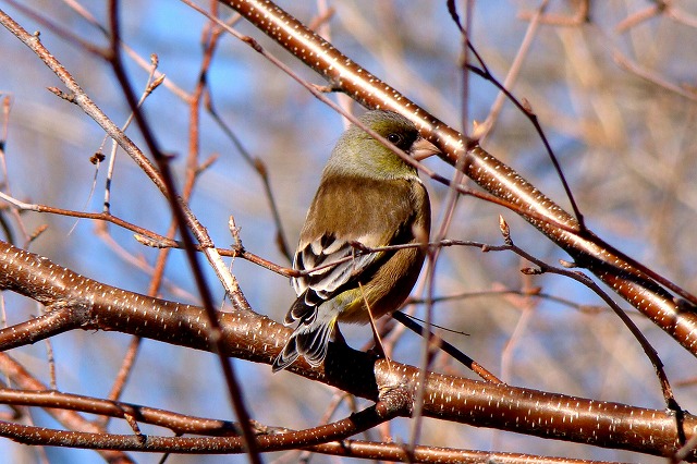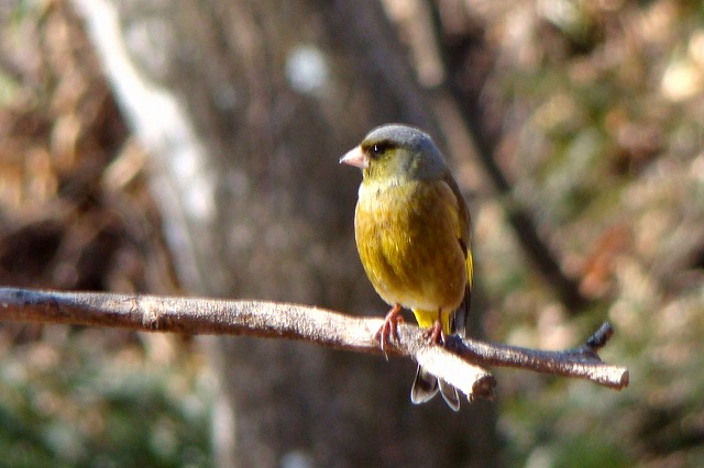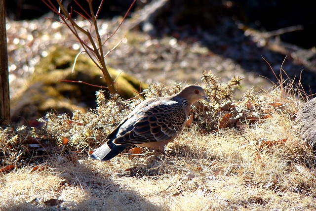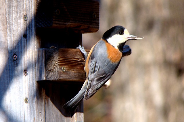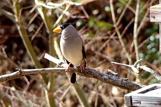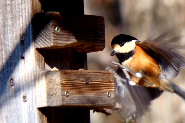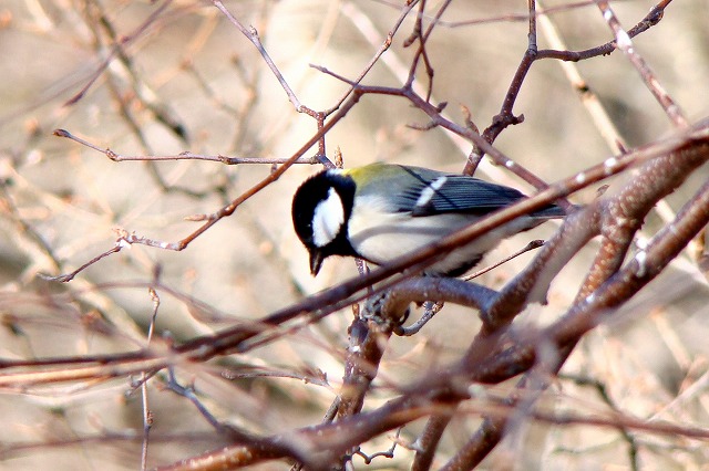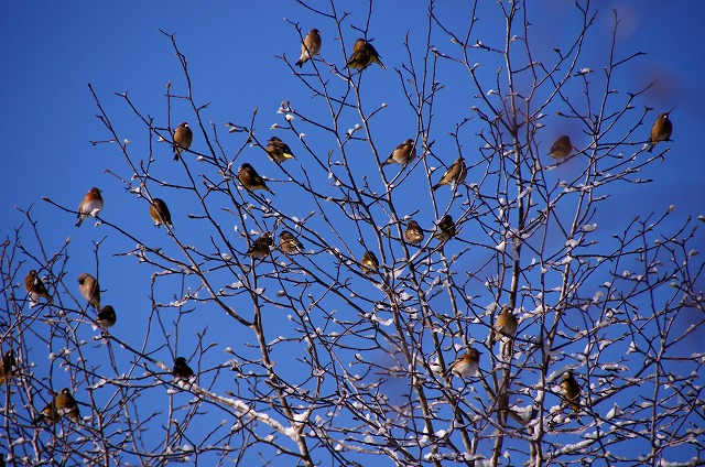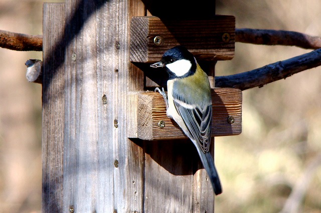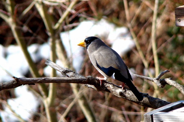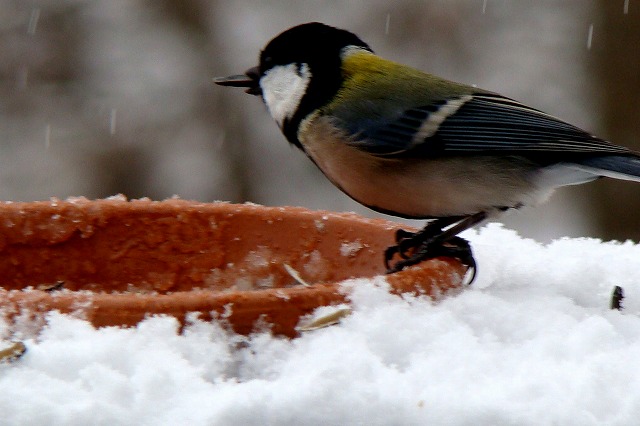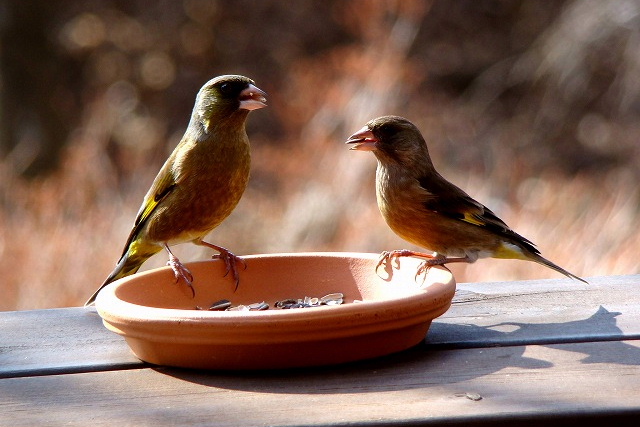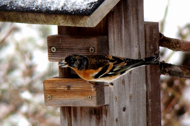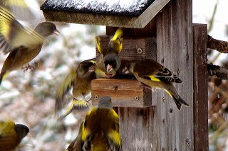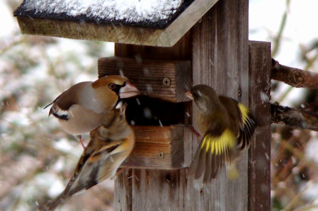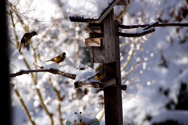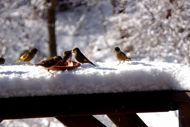 餌台にやって来る冬の野鳥を部屋の中からガラス