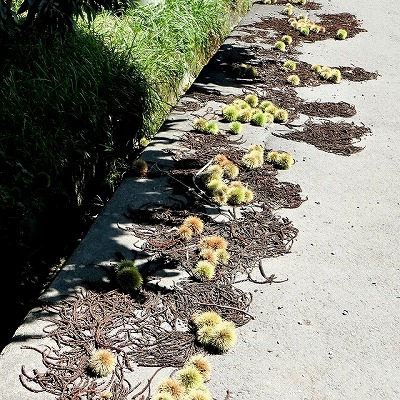 散歩中の道路脇に鈴なりの栗の木に出会いました。