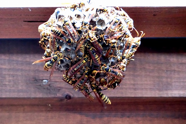 軒下に作られた蜂の巣二つ、大分大きくなり、蜂の数も多く、刺