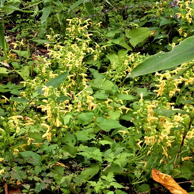 手入れがされてない、ちょっと薄暗い杉林にフネツリソウが繁殖