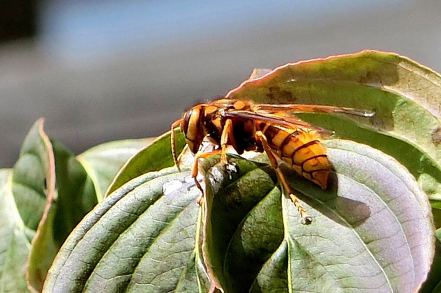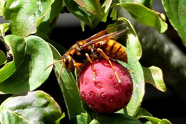 されたら痛いので、蜂さんには申し訳無いが、長い棒で落とさせ