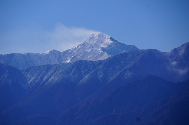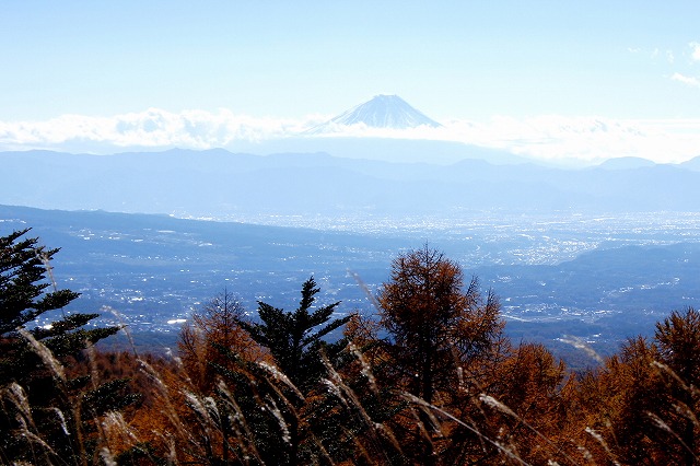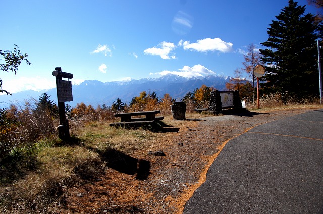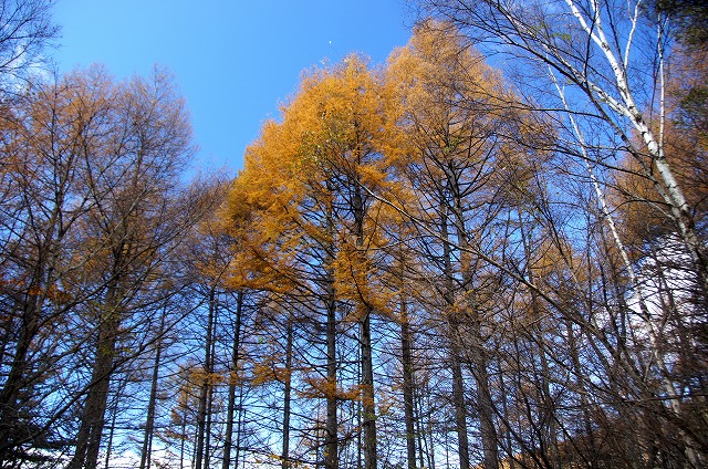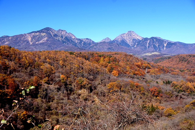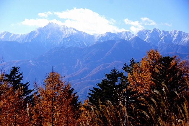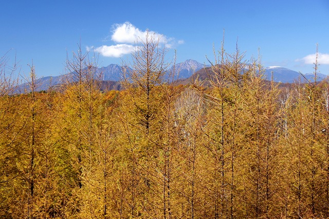 自然公園の黄葉したカラ松越しに八ヶ岳が見えました。