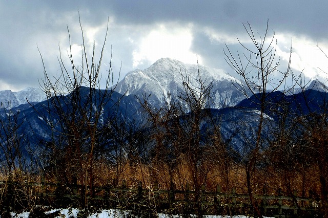 甲斐駒の最も雪が多い時期でしょうか!雑木林越しに写して見ました。 |