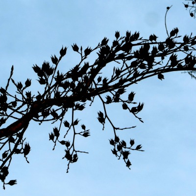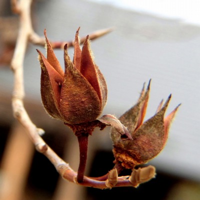 冬の硬い実、5裂して果殻(かかく)が春先まで残りますが、果殻の側に珍しい冬芽?・・・