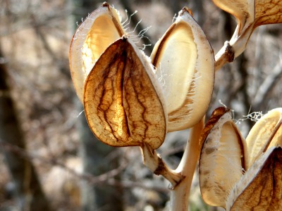 | 枯れ草の中に茶色い茎に大きな実の殻が目立っていました。 |