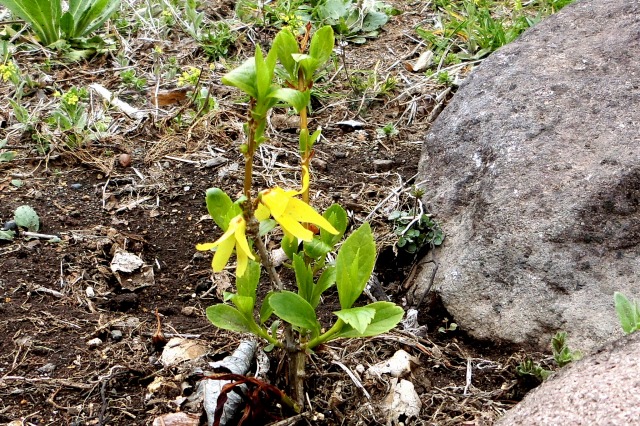 このレンギョウ、昨年、茎の先端を水を入れた小さなビンに入れておいたら