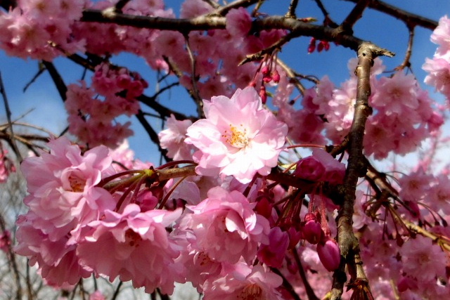 ここの桜、あまり垂れ下がっているようには見えないのですが、ピンク