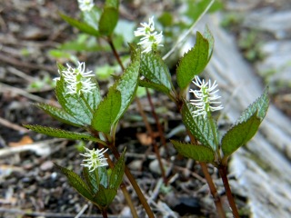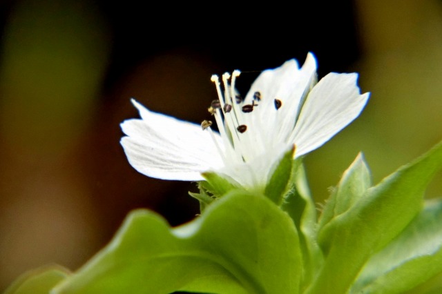 花は1センチ位の白花、雄花が10本、花柱が3本、葉が対生してい