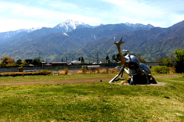 芝生広場に置かれた巨大なカブトムシのオブジェ。 すぐ前は中央道が走っています。 |