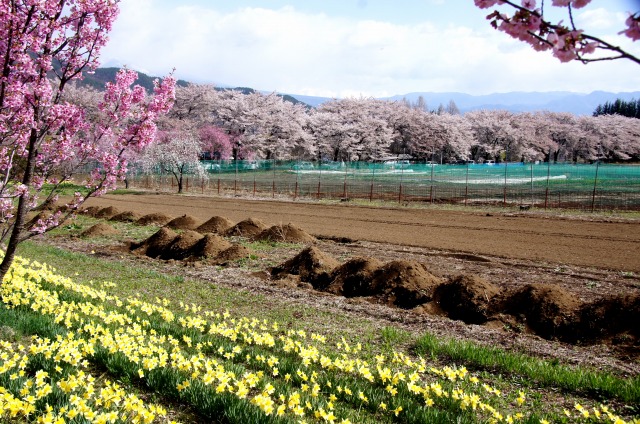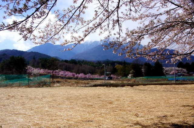 桜並木の枝越し、牧草地の先に「しだれ桜の里」が見えます。残雪の山は鳳凰三山です。