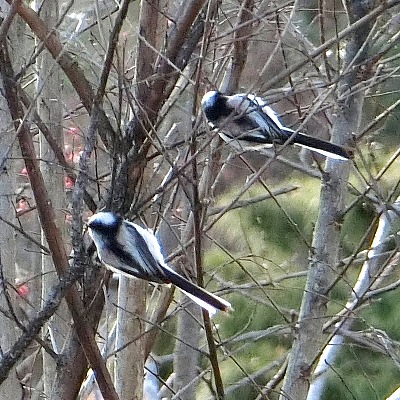 シジュウカラは餌台から一つくわえて近くの枝で食べるのですが、上手に