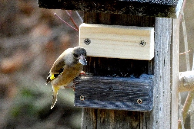 カワラヒワは平らな場所にエサを置くと居座ってしまい、居座れないような