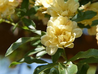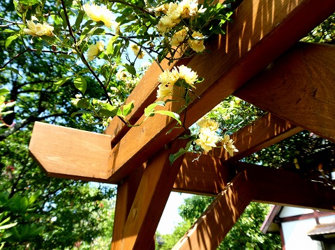 パーコラに絡んで咲く「モッコウバラ」。 淡い黄色の八重咲き。 |