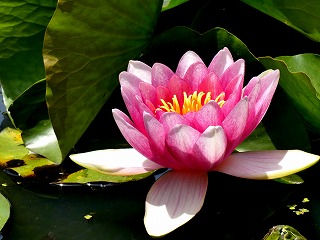 水面に浮かんで咲く「スイレン」、葉は切れ目が入る。 |