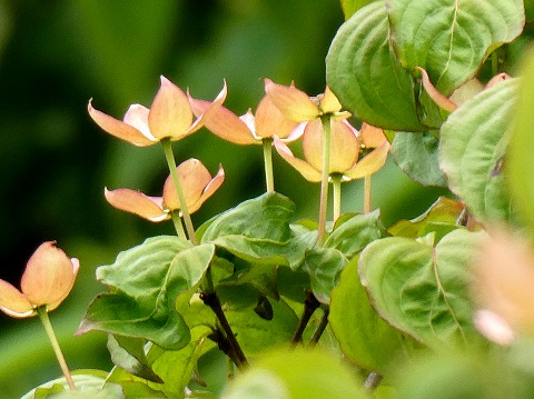 ご近所の「ベニバナヤマボウシ」が咲き始めました。薄赤い花びらのように