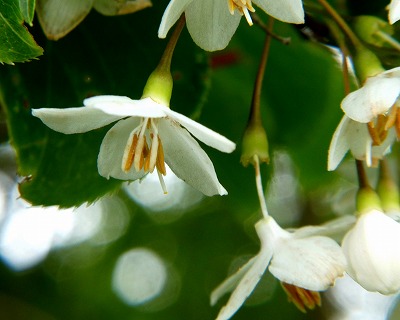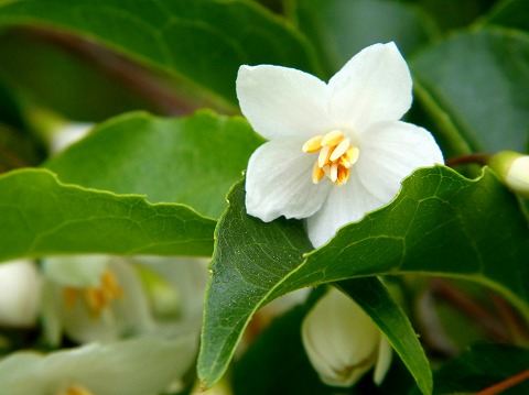 咲き始めの「エゴノキ」の花。 葉の縁は細かい鋸葉。 |