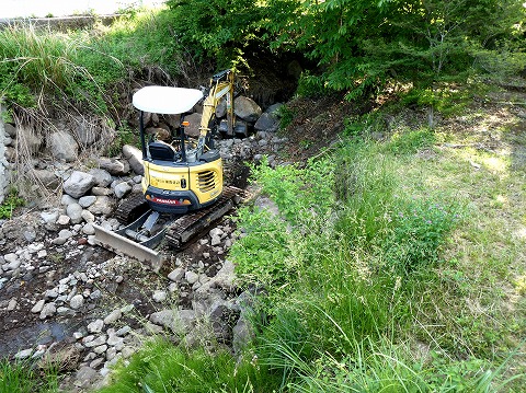 なっていたため修復工事が始まりました。川の上流からショベルカーを下ろし