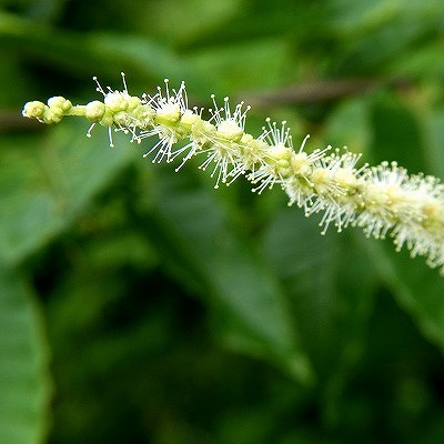白い雄花は長い花糸を付けています。 雌花は花序の基部に咲きます。 |