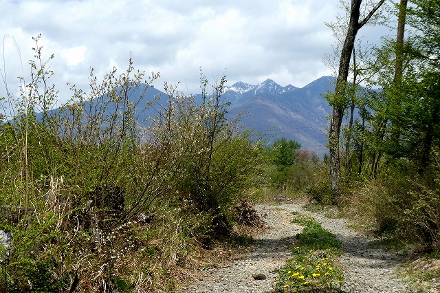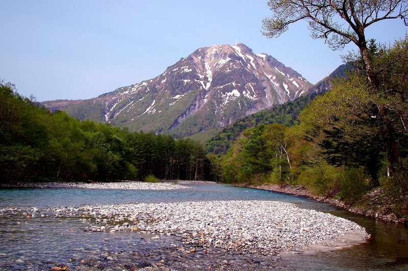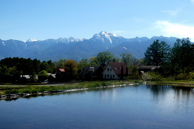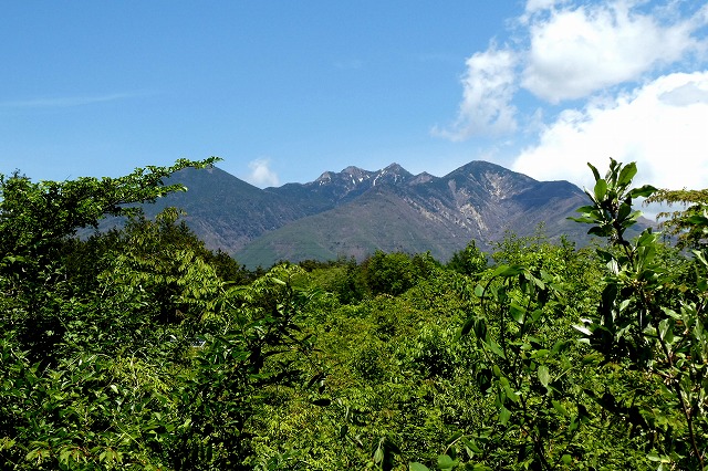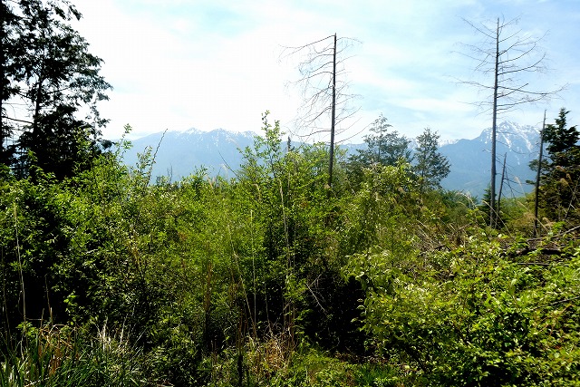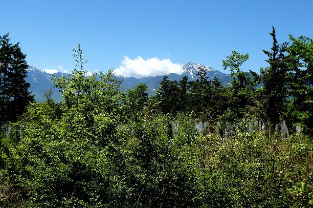 新緑を前景に鳳凰三山の残雪が輝いています。