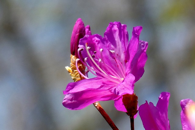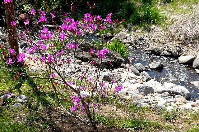 河川敷の斜面に植えてあった「ミツバツツジ」の赤紫の花が咲き始めました。
