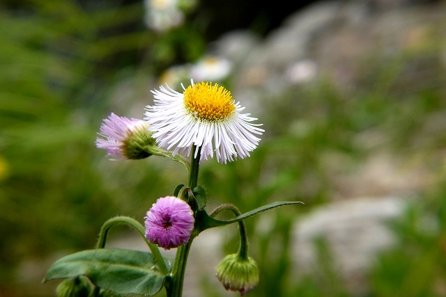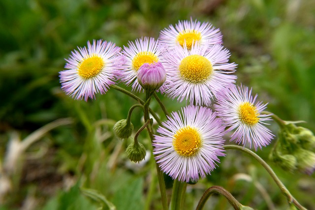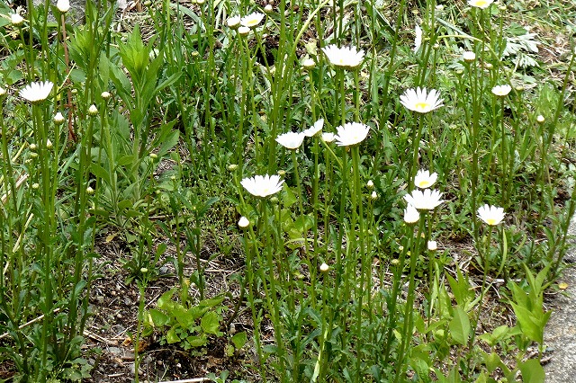 「ハルジオン」と「ヒメジョオン」はよく似ているが、先に咲くのが「ハルジオン」、蕾が下向きかげんで、花びらは紅紫色に近いと言われるが、現在では白色に近いものが多い。