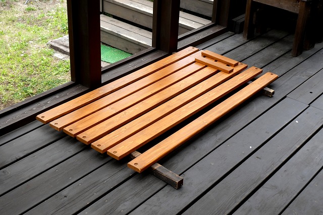 ガーデンベンチの修理、背もたれのねじ穴は仮組をして現物あわせで加工します。