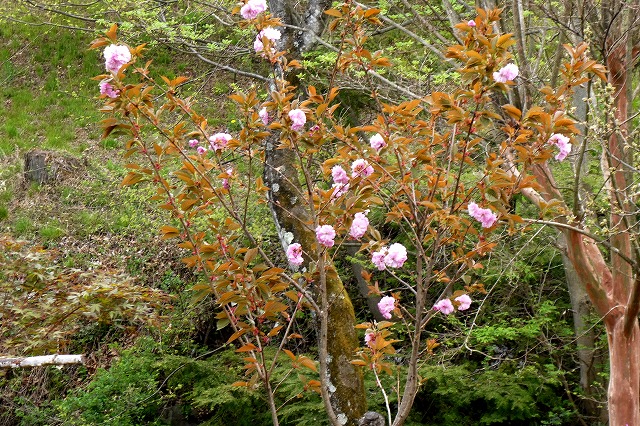 河川敷の斜面に植えた「ヤエザクラ」、大きくしたく無く芯を摘めたが、今年は細い枝に多く咲いた。