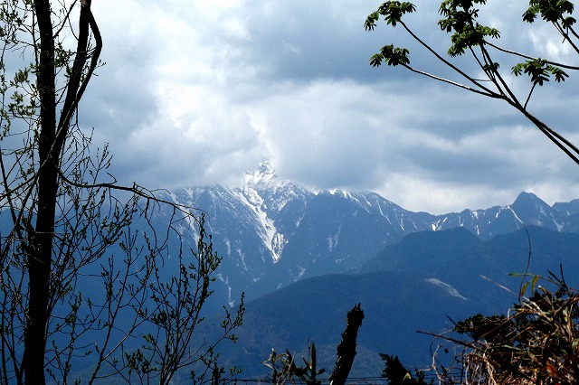 晴れていますが南アルプスは雲が多く、雲の切れ間から見える甲斐駒は三角形に見え、まるで槍ヶ岳のようです。