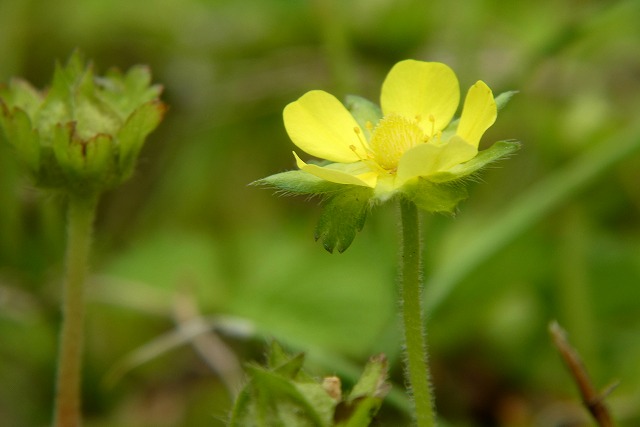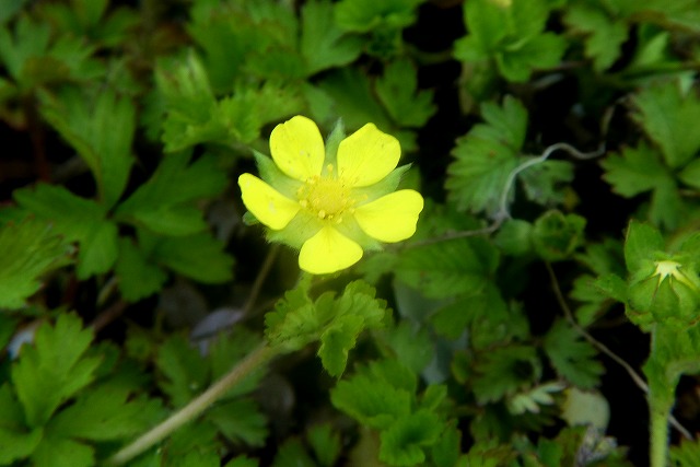 5月ごろ「ヘビイチゴ」の黄色い花がたくさん咲きます。この時期他にも似たような花が咲きますが、花びらに間があり萼片と花びらの大きさが同じで「ヘビイチゴ」のようです。