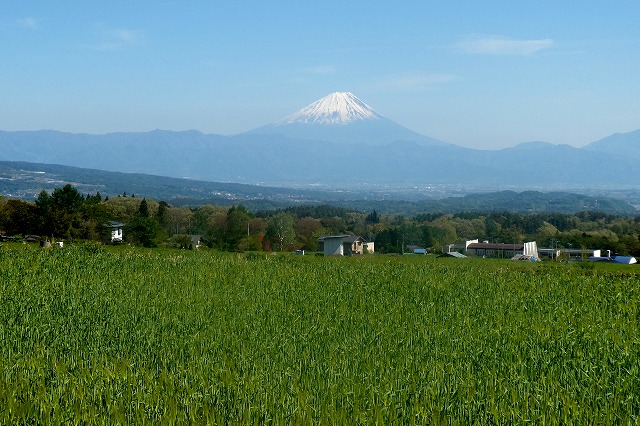 麦畑の後方に富士山?今日は曇で見えない。