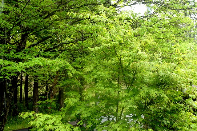 新緑の季節、赤いモミジが目立ちます。