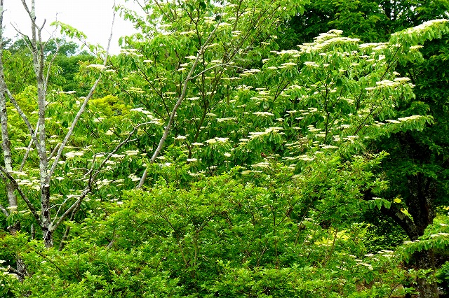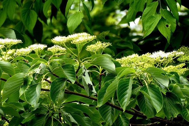ミズキの花、葉の上に白く咲き段々畑のようです。 |