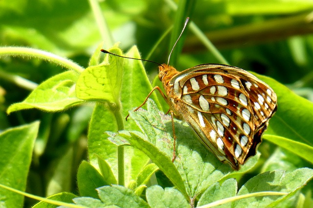 緑の葉の上にヒョウモンチョウが止った。