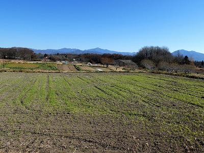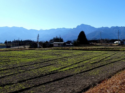 出掛けついでに天気が良く、三分一湧水公園近くの畑から青空の山々を撮ってみました。