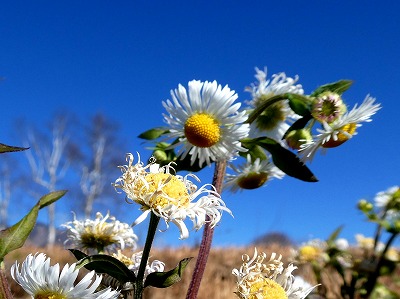 | 澄み切った青空を背景に、枯れる寸前の ヒメジョオンと思われる花が咲いていました。 |