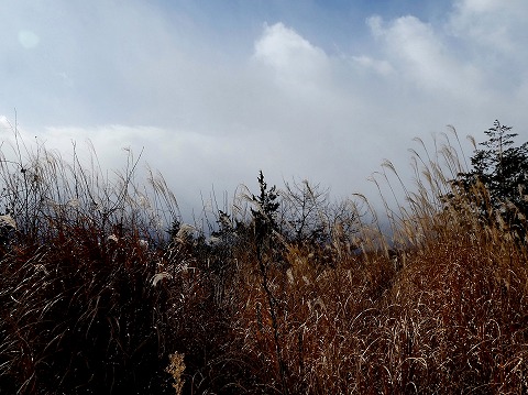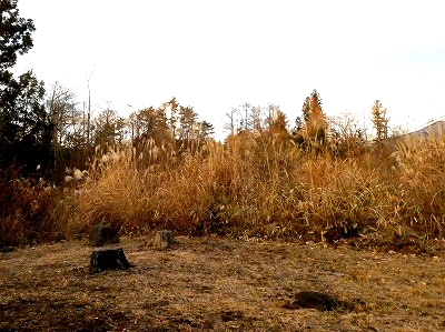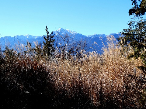 | 甲斐駒が見える草地にススキの白い冬枯れ穂がなびいていました。 |