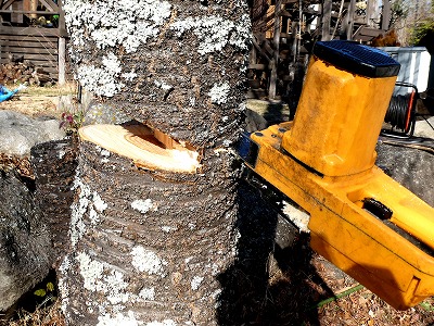 | 太いところで35センチの幹をストーブ用薪の長さに切る。 |